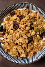 Once completely cool, transfer the granola to a large clean bowl. Add the 1 cup of raisins (or other dried fruit) and toss to combine. The dried fruit is added now to keep it soft and plump. Your granola is finished!