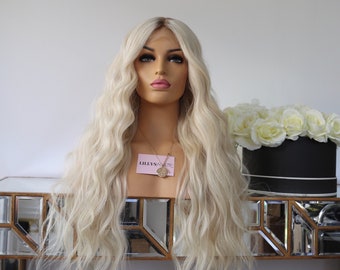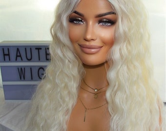 13x4 lace front wig with natural hairline and soft blonde blend describes the construction. A "13x4" lace front means the sheer lace panel at the front is 13 inches wide (ear to ear) and 4 inches deep. This provides ample parting space and a hairline that can be styled away from the face. The "natural hairline" means the lace is pre-plucked and the hair is hand-tied to mimic how hair grows from the scalp, with baby hairs often included. The "soft blonde blend" suggests a multi-tonal platinum, not a flat, one-dimensional color, which adds realism and depth.