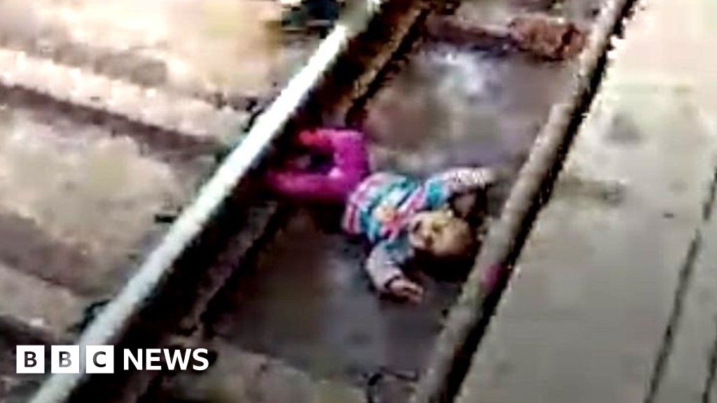 Baby in India narrowly escapes being hit by speeding train